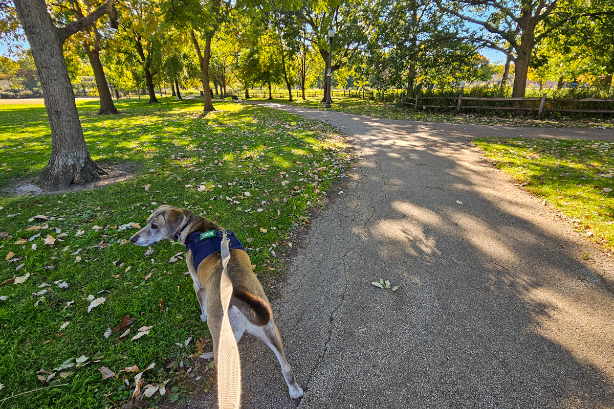 This afternoon we took a half-hour walk through the local park because the weather is absolutely perfect. Whenever I stopped to try to photograph the two dogs, they immediately went in separate directions, so this is the best I could do: