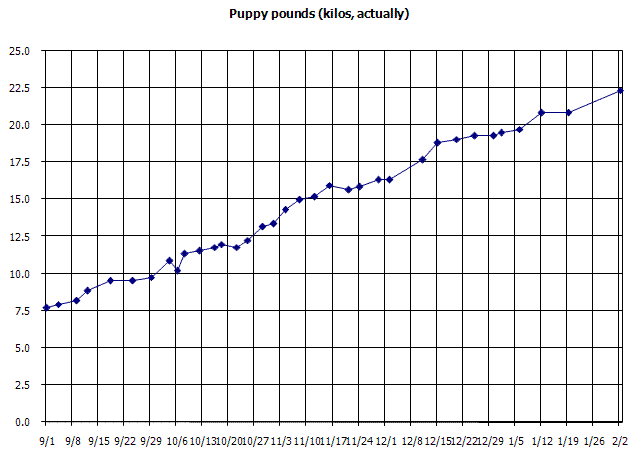 It turns out, despite a brief plateau in January, Parker continues to grow by about 600 g per week. He's now up to 22.4 kg: