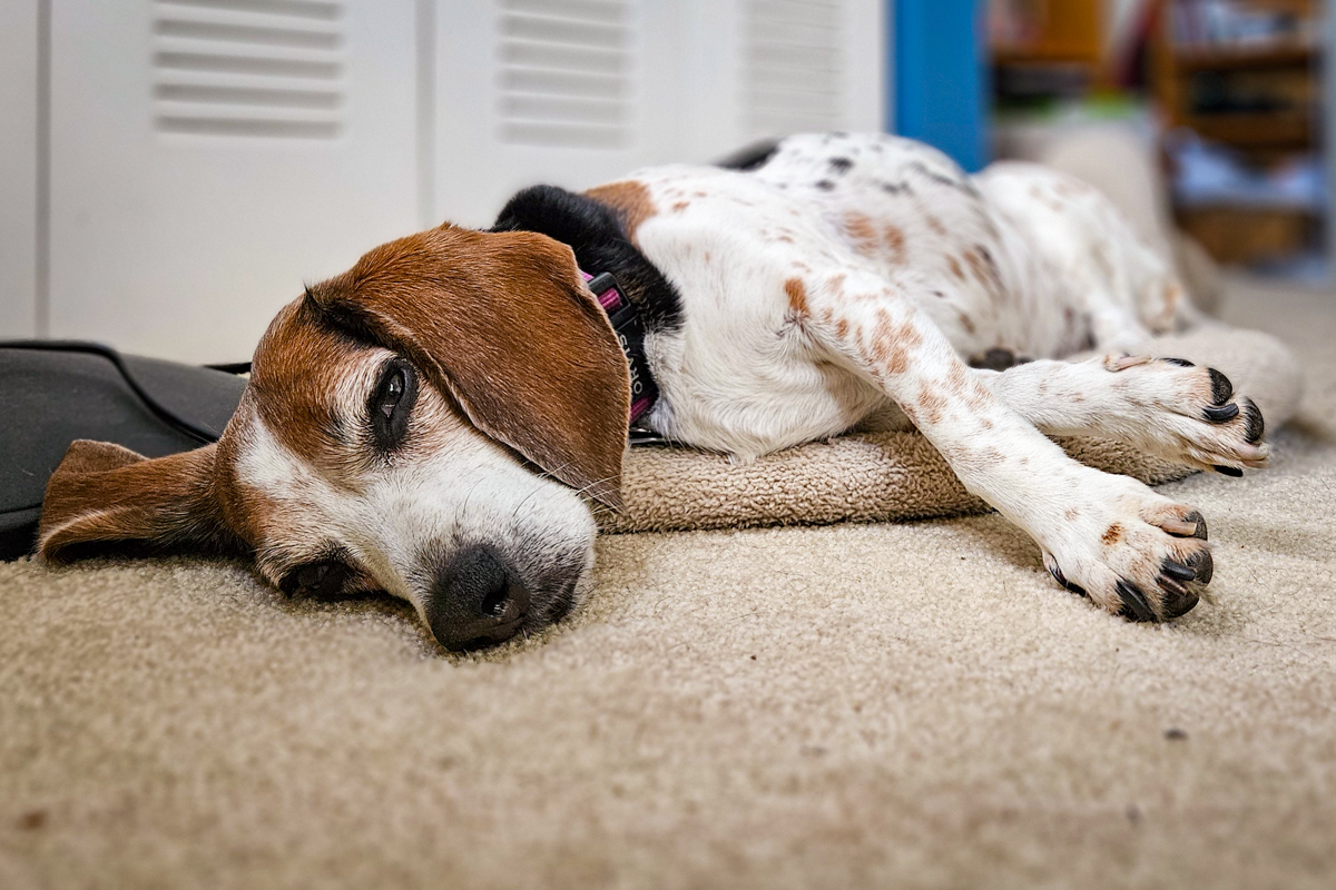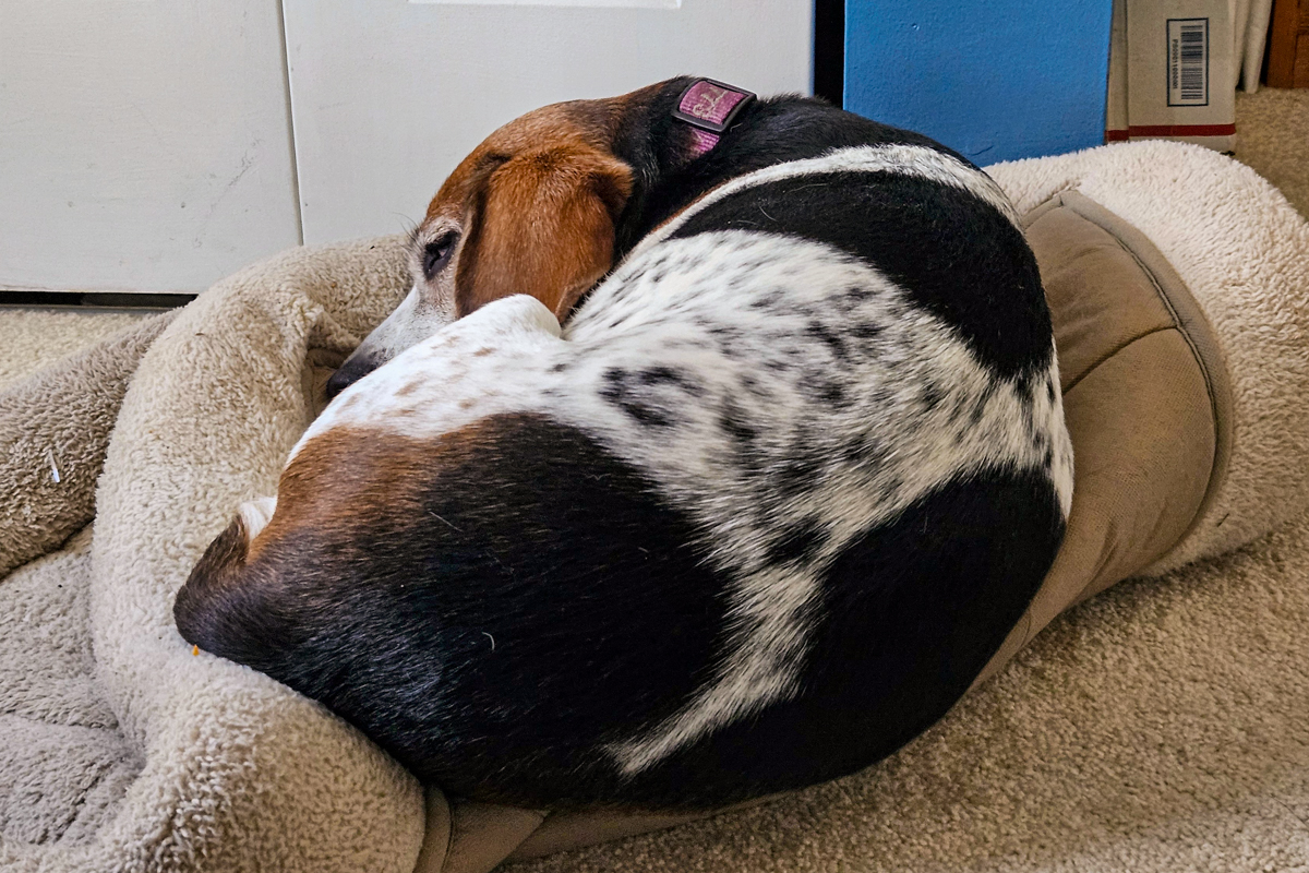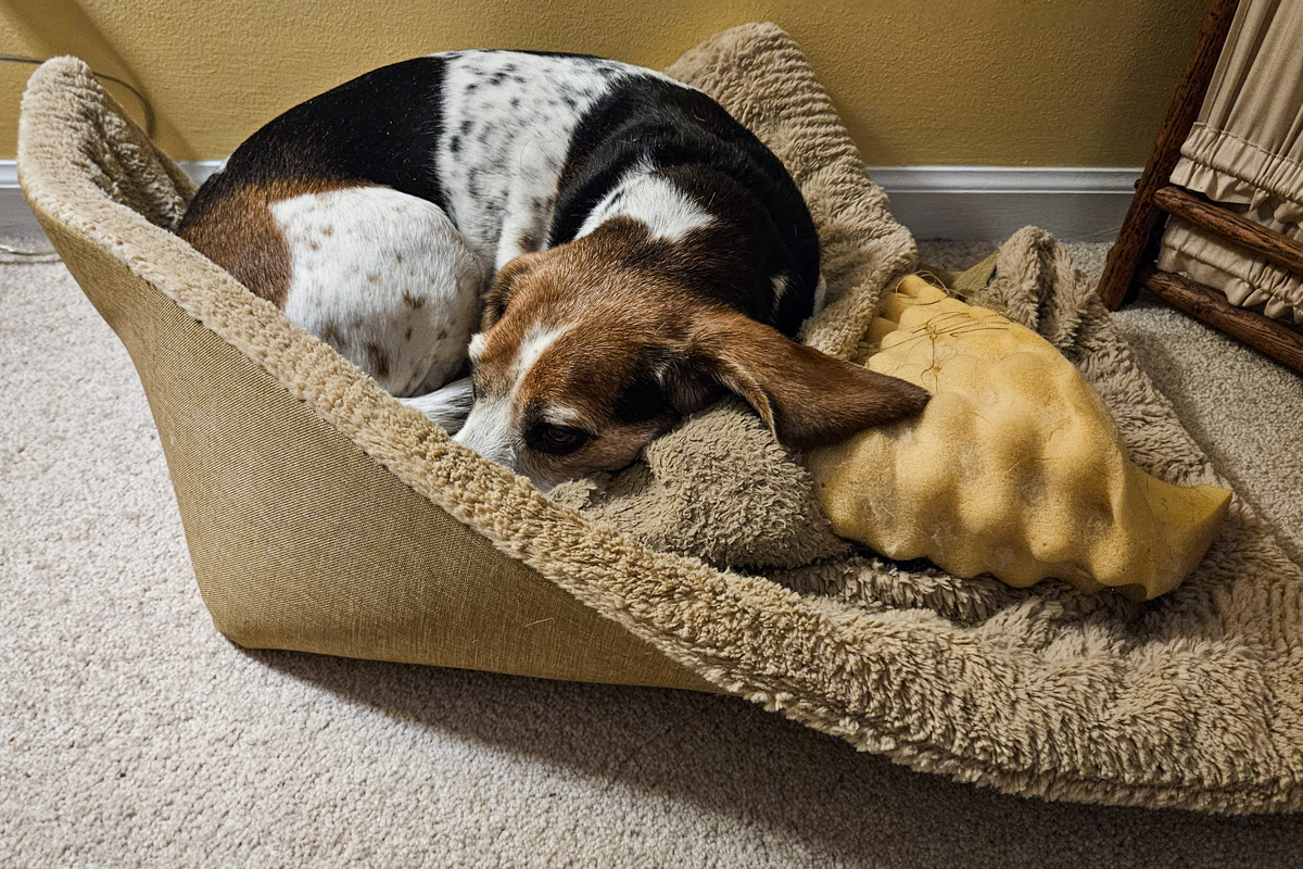 Of course, having met this beagle before, I've rolled up a rug and closed a couple of doors. She has decided that my office is a good place to be, which works for me because I can see her.